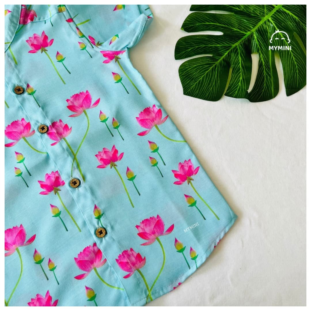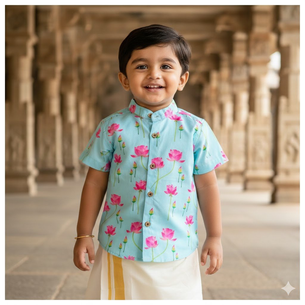Shop Pongal collection Soft ocean blue cotton shirt with an all-over pink lotus print and gentle on baby skin (6–12M to 10Y). Elegant, breathable, and festive wear for pongal , weddings & cultural events.