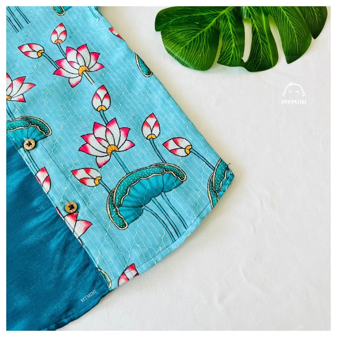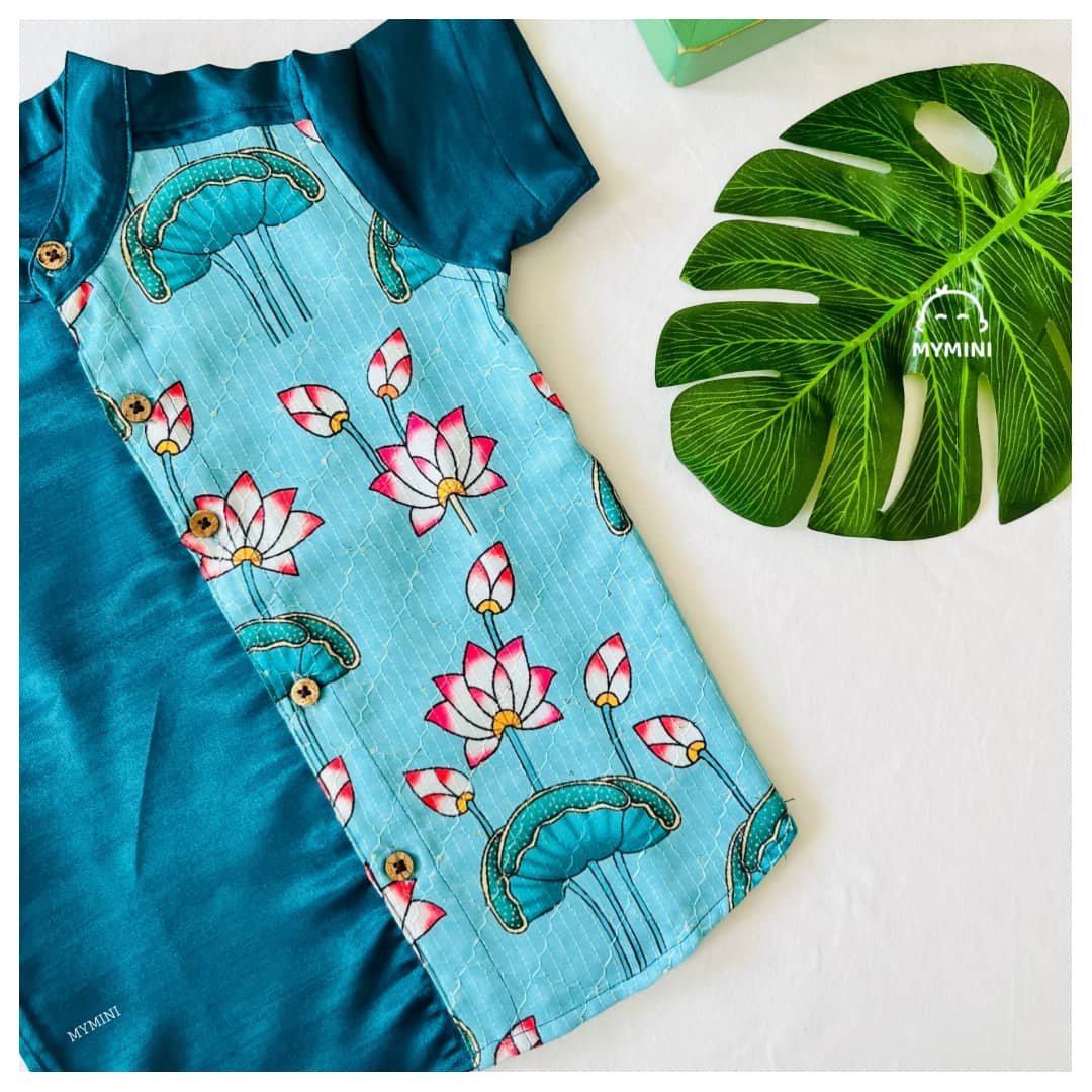 Little Maharaja Festival collection a rich teal Silk Look Fabric paired with Pichwai lotus panel
