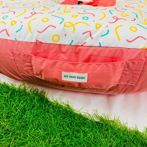 MyMini U-Shape Feeding Pillow with 100% cotton washable cover, soft poly fiber filling, back buckle for extra support, and easy-carry handle – perfect for breastfeeding, newborn comfort, and tummy time.