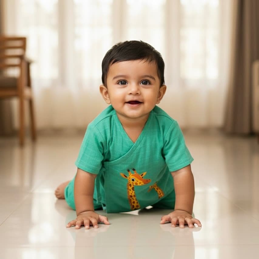 This baby kimono top & pant set features an adorable mother–baby giraffe fusing print that adds a playful charm without any heaviness on your baby’s skin.