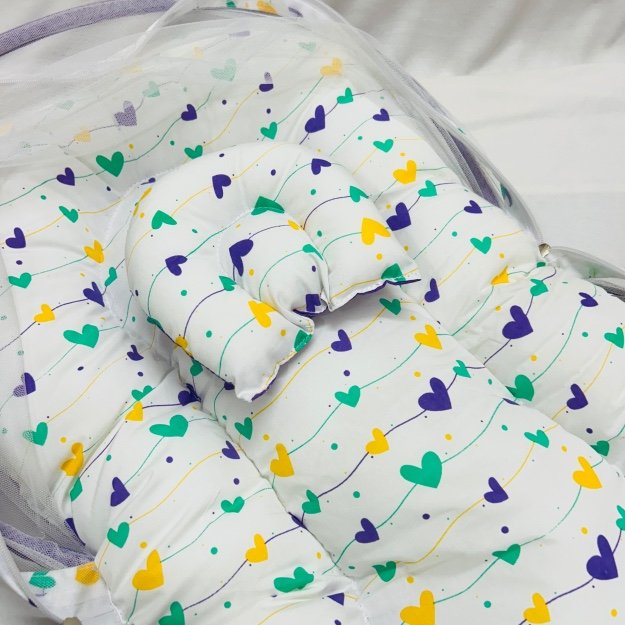 Our newborn baby bedding set with mosquito net is thoughtfully designed for your little one’s safety and sleep comfort. It features an ergonomic anti-flat head pillow that supports healthy neck alignment, while the built-in protective net keeps mosquitoes and bugs away. Crafted with fine cotton fabric and a high-density 30mm mattress, this set ensures a soft, breathable, and cushioned sleep surface.