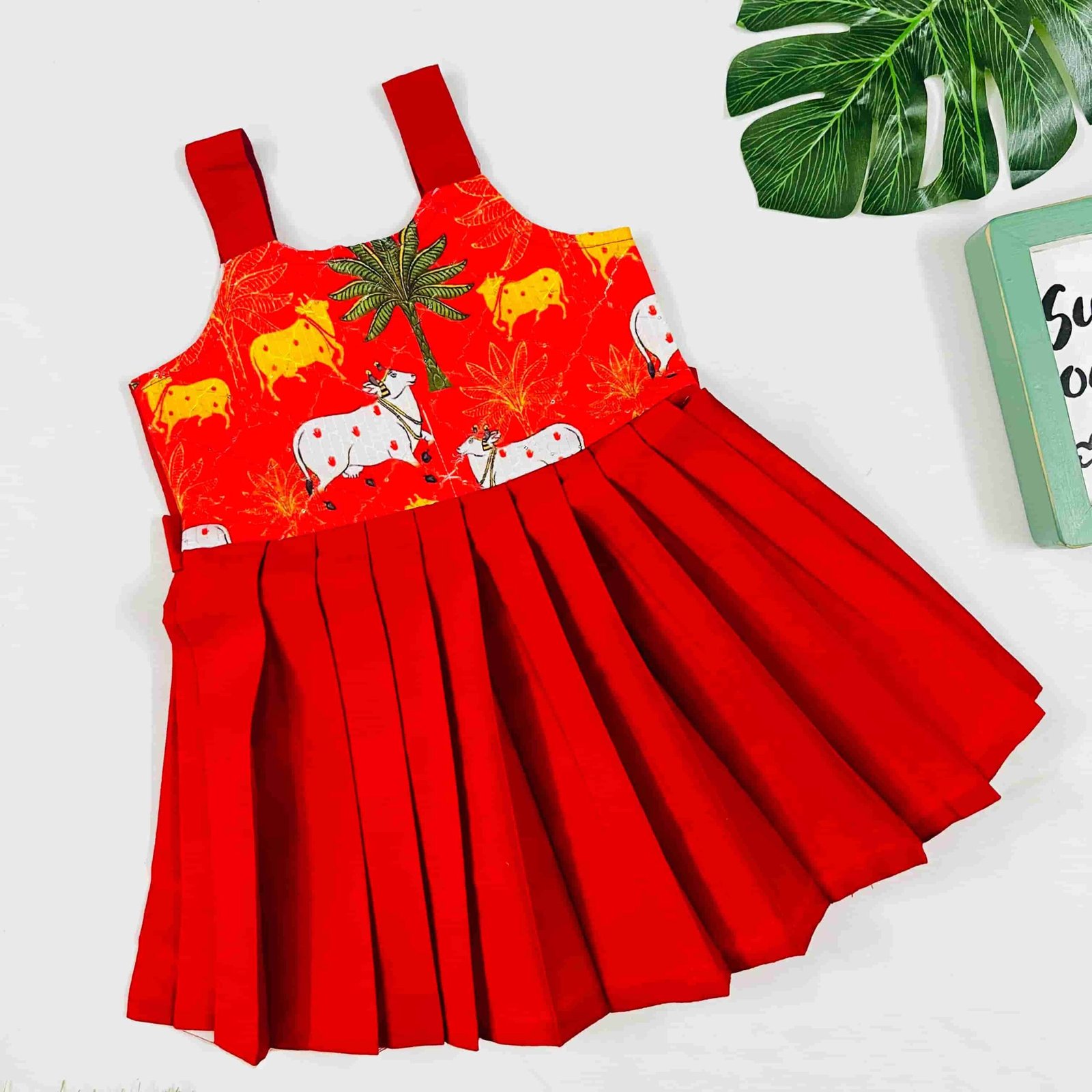 The MyMiniBuds Little Maharani Pichwai Raw Silk Cotton Frock is crafted from rich silk cotton fabric featuring intricate lotus-inspired Pichwai prints. Designed with a soft inner lining for comfort, this sleeveless frock ensures your little one stays festive-ready and comfortable all day long.